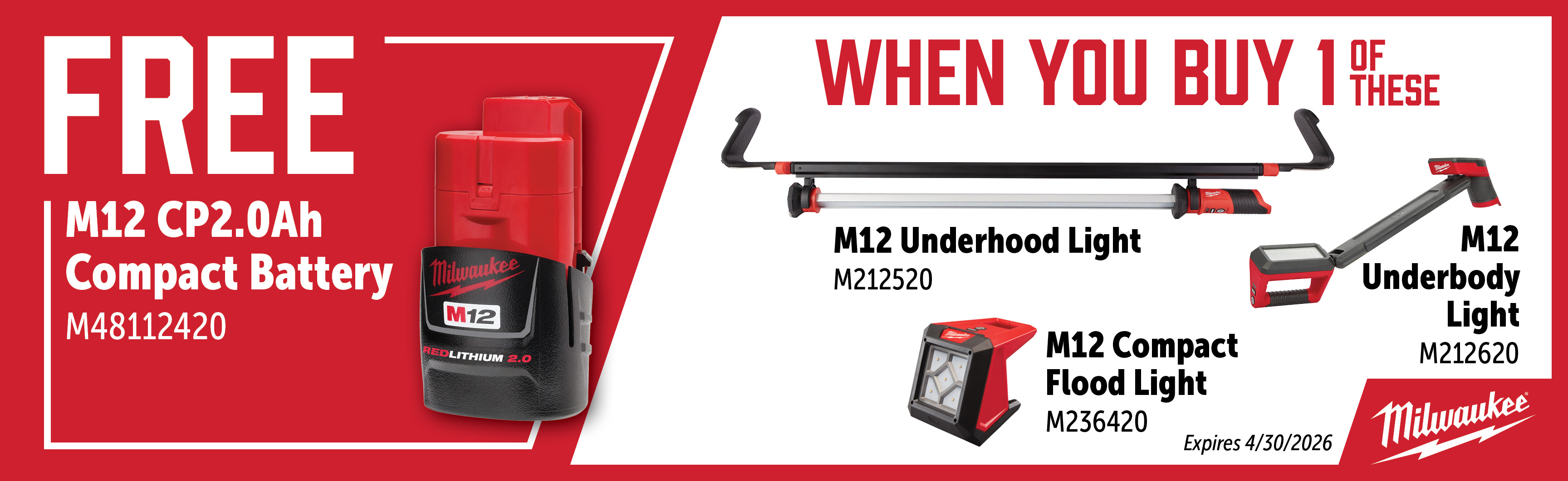 Add a qualifying M12 light and a M48112420 to your cart. The M48112420 will be discounted in your cart.